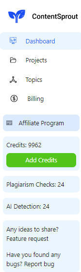 **Plagiarism** and **AI detection** credits are shown below your main credits. PLEASE NOTE: This feature is being developed and DOES NOT work. This should be resolved by 3/1/24.\